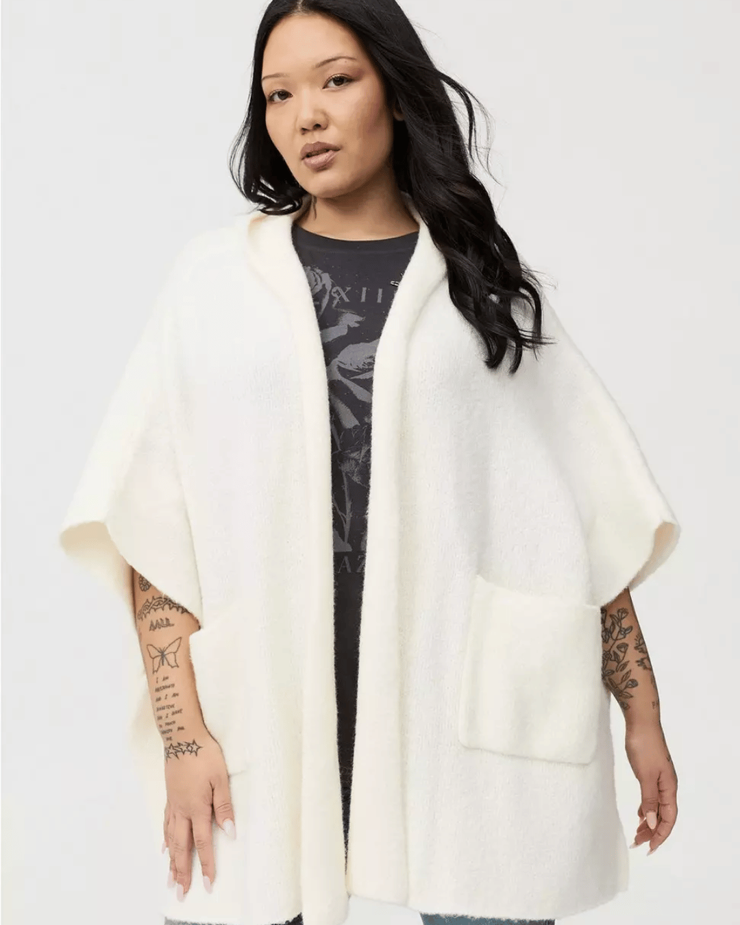 Cozy, chic, and effortlessly roomy—this hooded ruana with pockets is perfect for layering and staying stylishly comfortable anywhere.