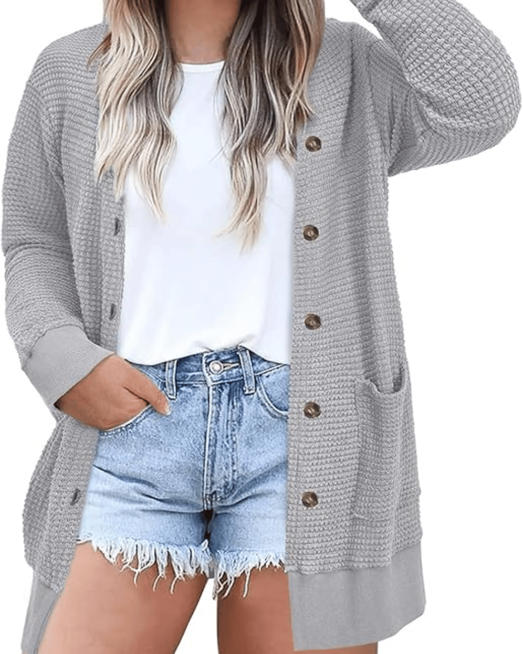 This waffle-knit cardigan layers effortlessly, pockets are perfect for small essentials.